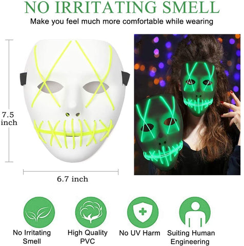 Luminous mask: It is made of white PVC plastic and includes an elastic band to fix the mask around the head. The LED mask also has openings in the eyes, nose and mouth area.